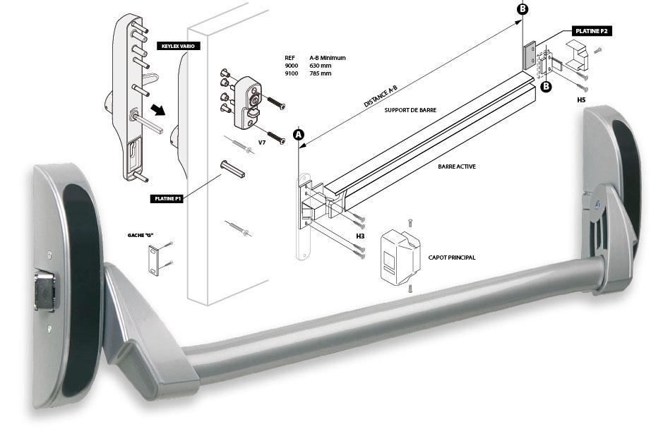Le montage sur barre anti panique des contrôles d’accès est rendu possible avec des ensembles d’adaptation selon les modèles,